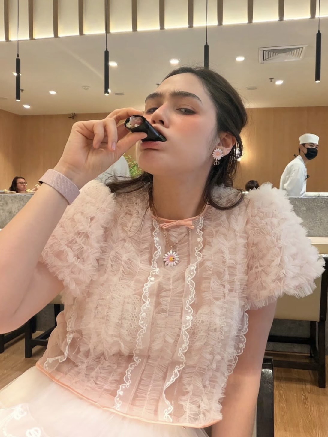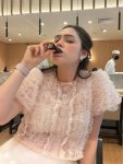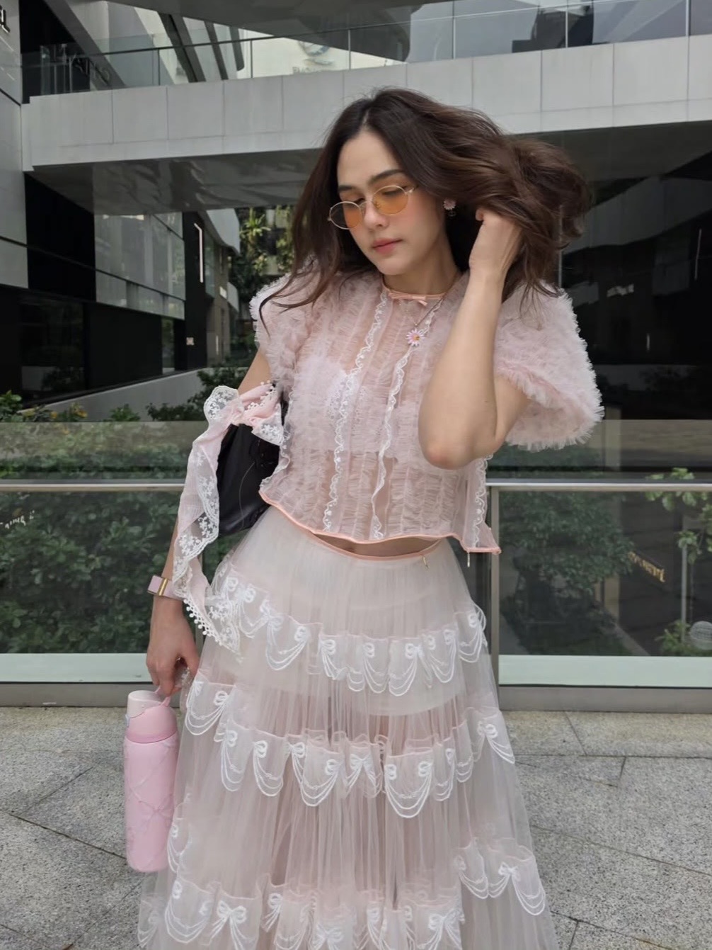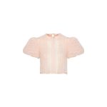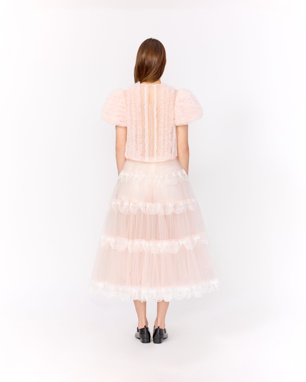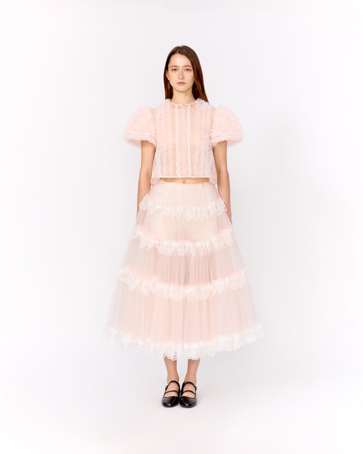PUFF SLEEVE DOUBLE LAYER RUFFLE STRIPE TULLE CROP TOP